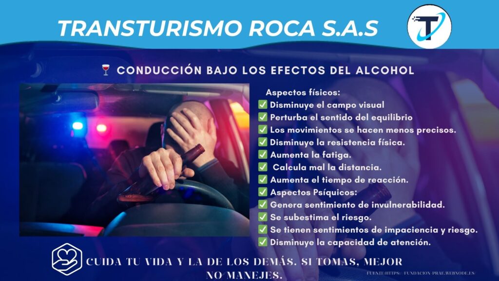El alcohol y la conducción son una combinación letal. Los efectos físicos y psicológicos del alcohol merman nuestras capacidades y nos convierten en un peligro para nosotros mismos y para los demás. Por eso, la decisión más inteligente y responsable es: si vas a conducir, no consumas alcohol; y si has consumido alcohol, busca alternativas seguras para llegar a tu destino. Tu vida y la de los demás valen mucho más que unos tragos, desde TRANSROCA, queremos que cuides de ti.